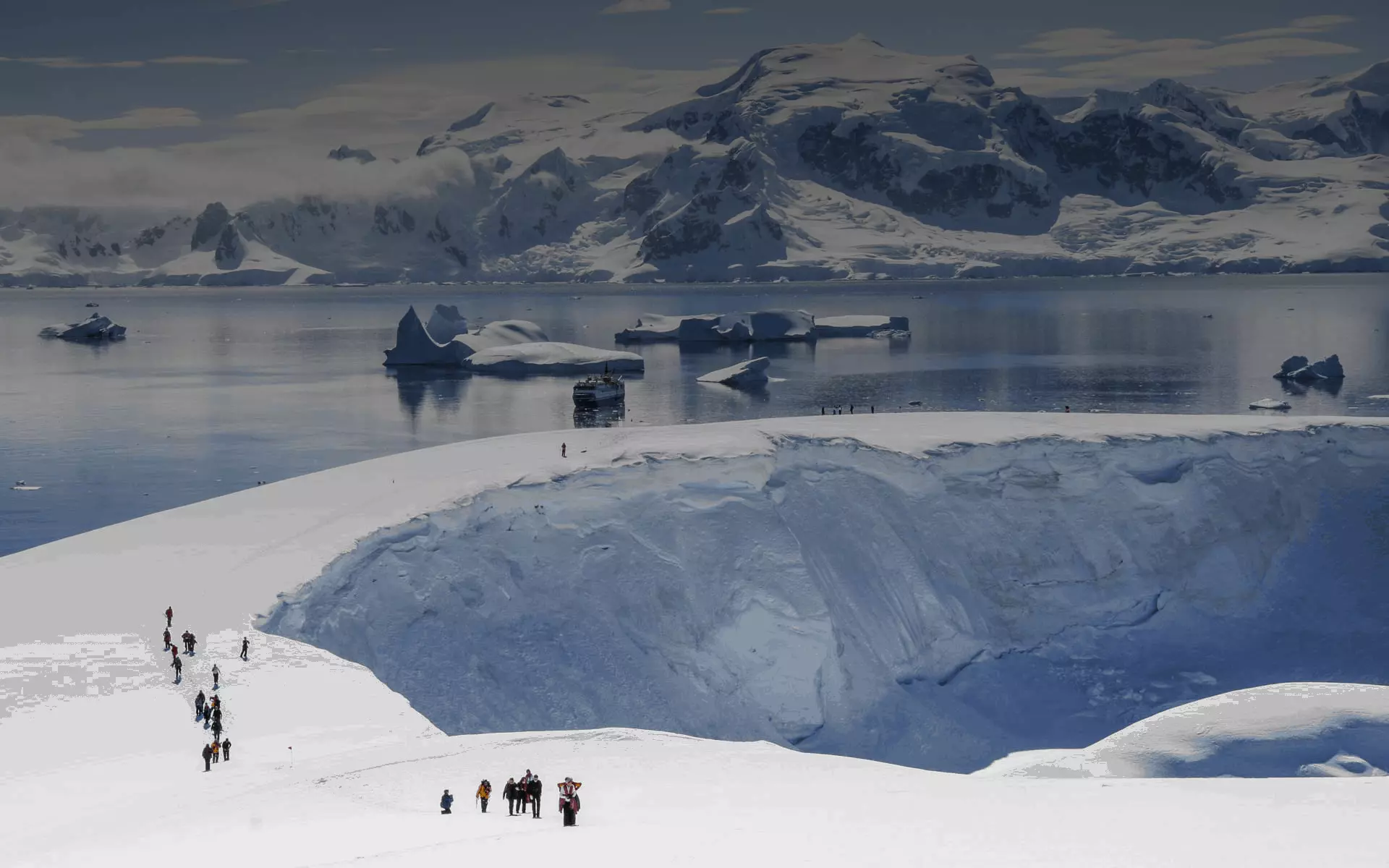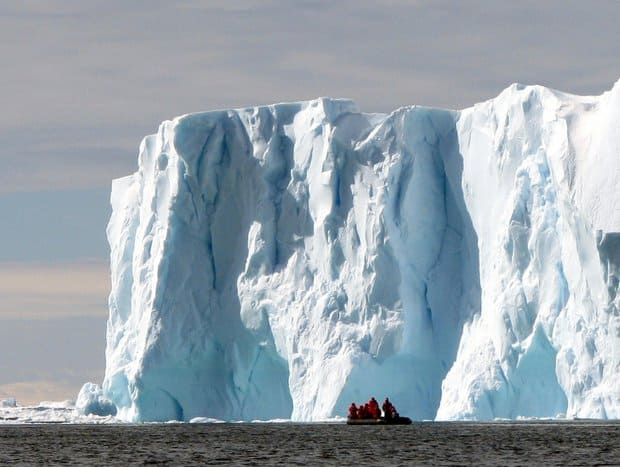 Guests off a small ship cruise on a skiff excursion in front of a massive glacier in Antarctica.