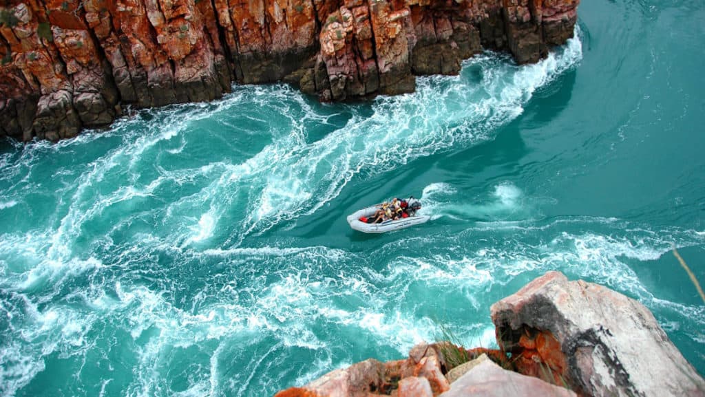 The Horizontal Falls are one of the Kimberley’s biggest attractions and are a result of the mammoth 36-foot tides the Kimberley is renowned for. Naturalist David Attenborough described the Horizontal Falls as “one of the greatest natural wonders of the world.” This natural phenomenon has been created as the ocean thunders through a narrow gorge in the McLarty Ranges. Water builds up on one side and is forcibly pushed through the bottleneck, creating a rushing horizontal waterfall of swiftly flowing seawater. Riding the rapids on Zodiac inflatable tenders is one of the highlights of Kimberley expedition cruises.