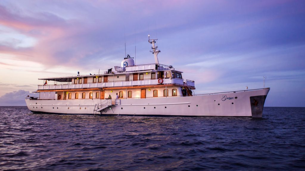 The 16-passenger Galapagos Grace was a wedding gift from Aristotle Onassis to Prince Rainier and Princess Grace of Monaco, and it was on board this vessel where they spent their honeymoon getaway. Cruise back in time and lay back in luxury, enjoying one of the finest Galapagos luxury cruises available in the Galapagos Islands. The Grace boasts a high crew-to-passenger ratio, spacious cabins and stylish lines. The carefully selected professional and friendly naturalists aboard are the most knowledgeable in the region, with an average of 15 years of experience guiding on the islands. Travelers comment that the service on board this ship, coupled with the true feeling of a safari experience, is unlike anything that is currently offered in Galapagos.