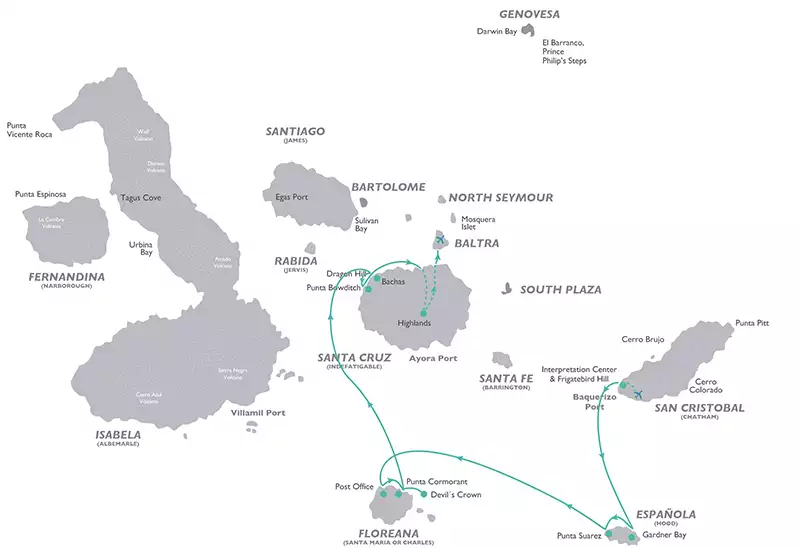 Use the itinerary as a guide only. Itineraries may be altered due to weather, wildlife, national park regulation or at the captain’s discretion. Due to the active nature of volcanoes in the Western Galapagos, alternate excursions may be offered. The ability to be flexible makes this type of small ship cruising unique.