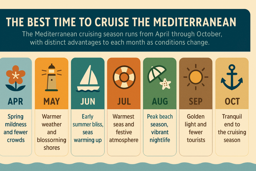 April through October is prime time for cruising the Mediterranean. The season is typically divided into three parts—spring, summer, and fall—each with its own weather patterns, wind conditions, and ocean conditions that can influence both itinerary and onboard experience. Lets take a deep dive into each season and month.