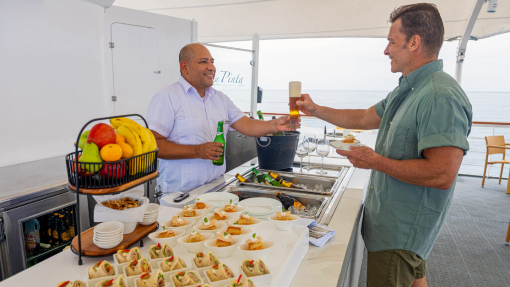 A gastronomy director ensures meals are a delightful arrangement of the best international cuisine and traditional Ecuadorian dishes. Breakfast and dinner are offered in the dining room on the Main Deck at intimate tables with plush seating. Lunch is served at the Outside Sky Bar and drinks are readily available at the Outside Sky Bar and Observation Lounge & Bar.
