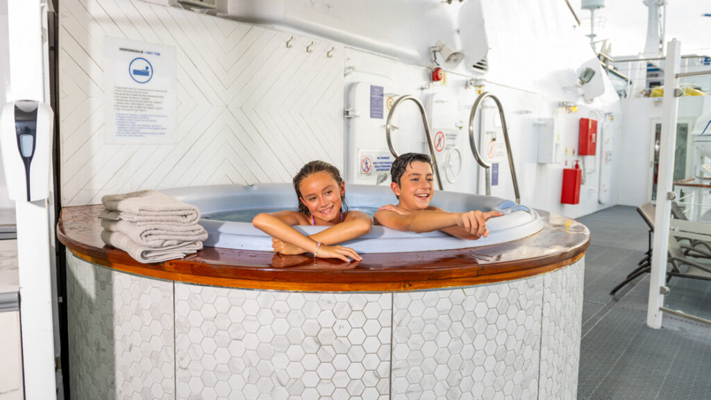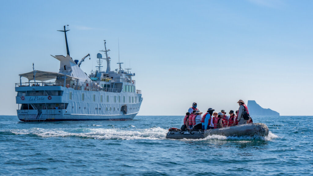 Daily activity options include snorkeling, sea kayaking, riding in pangas, hiking, swimming and observing the ocean via a glass-bottom boat. Wetsuit rentals are included with La Pinta cruises. The convenient aft platform makes accessing the islands seamless, as does the ability to board La Pinta at sea level. Glass-bottom boats are thoughtfully designed to enhance guest experiences with shaded hand rails and a shaded canopy. A hot tub, wellness area and onboard medical officer ensure true ease of mind. A medical officer is permanently on board and available 24/7.