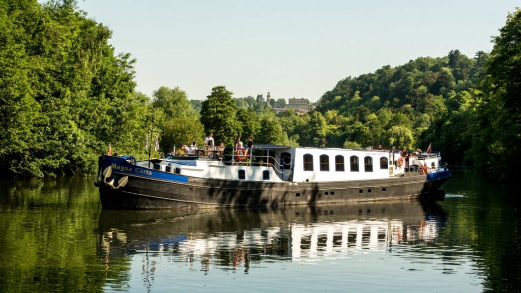 Choose the Magna Carta canal boat in England if you are seeking a stylish and refined England barge with a small guest count, doting crew and gastronomic delights. This hotel barge cruises some of the prettiest stretches of the Royal River Thames, accessing small art galleries, stately homes and beautiful gardens which larger riverboats can’t reach. Along the way, Magna Carta’s guests may enjoy walking and biking along an ever-present recreational path. This canal boat in England is also an ideal ship for private charter cruises, with theme options such as golf, theater, tennis and family cruises, or customize your own itinerary.