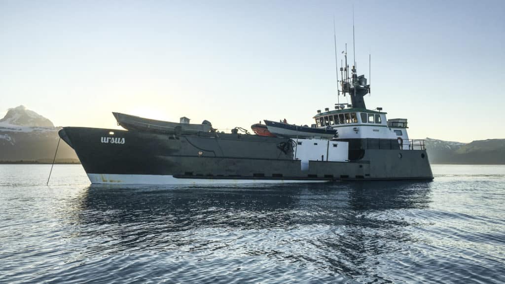The Ursus was originally built in 1984 as a crab fishing boat called the Time Bandit, which plied the storm-tossed waters of the Bering Sea and gained fame in the Discovery Channel TV series The Deadliest Catch. In 1989, the vessel was transitioned for research use by the National Park Service, Alaska Department of Fish and Game and other agencies conducting scientific study and monitoring. She has since been converted and comfortably appointed for custom marine charter use. In addition to Alaska bear cruises, the Ursus has outfitted two international filmmaking projects: the 2012 BBC/Discovery Channel documentary Great Bear Stakeout, and an NHK (Japanese public television) program on orcas hunting gray whales and humpbacks.