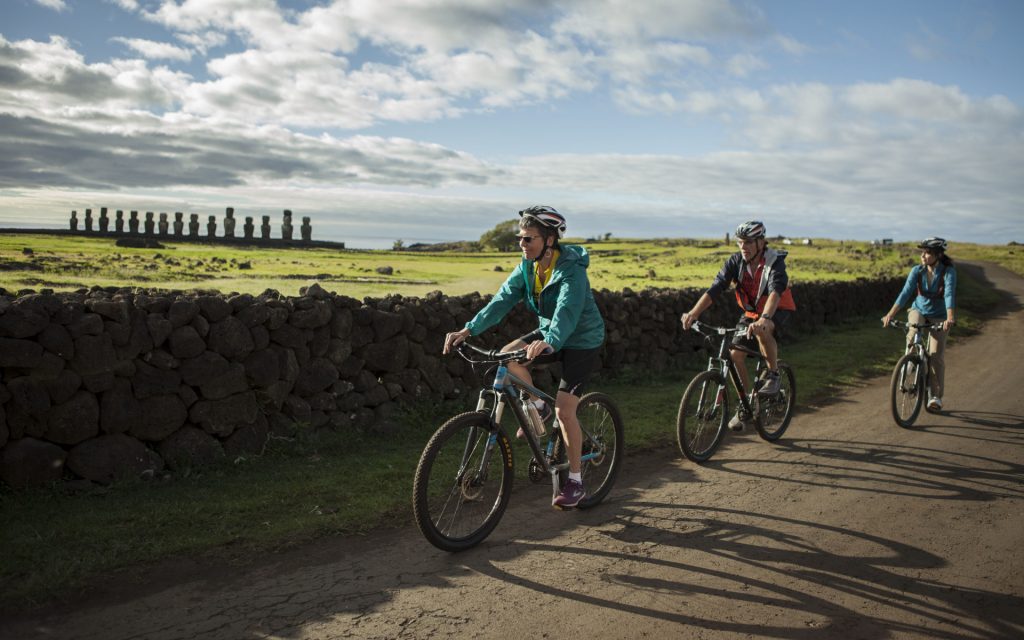 Whether you are looking for light activity options or more challenging outdoor pursuits, the guides can tailor most excursions to suit your skill level. Adventure activities enable guests to explore all corners of Easter Island, either by sea, bike, foot or van. Hikes and bike rides are among archaeological remains, volcanoes, beaches, prairies and cliffs. Snorkeling and (added-cost) scuba diving expeditions explore under the world’s most pristine sea waters. A bilingual English or Spanish guide will accompany each group of up to eight guests. Provided gear includes walking sticks and leg protectors for hikes, and helmet, bike and water bottle for two-wheeled excursions.