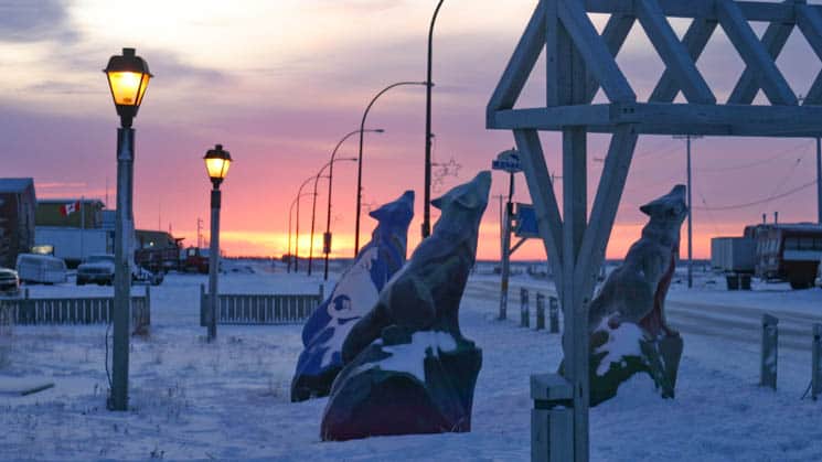 Wolf statues at sunset outside Churchill Hotels on the snow-covered streets of the Arctic town of Churchill