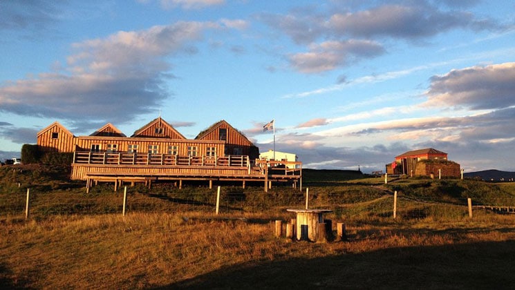 Long wooden building with sod roof, large deck & Iceland flag flying, on rolling grassland with farm equipment, at dusk.