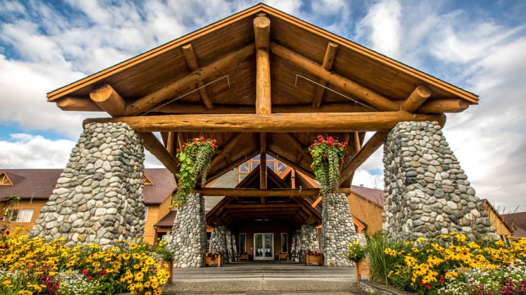 Exterior view of the front door with large stone pillars and A frame at Talkeetna Lodge in Alaska.